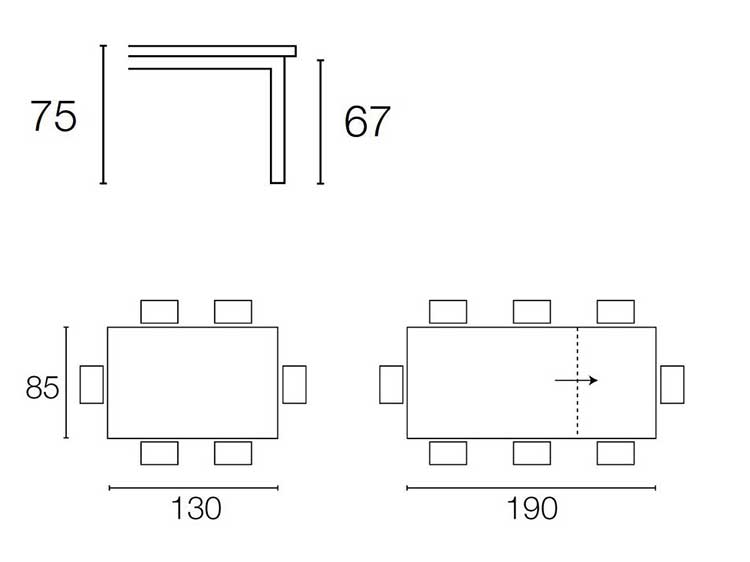 The tabletop can be used in two widths: 130 cm and 190 cm. To extend it, hold the legs and extend it, then pull up the extension tabletop hidden under the tabletop and rotate it 90 degrees. Finally, return the legs to their designated position to easily change the size.