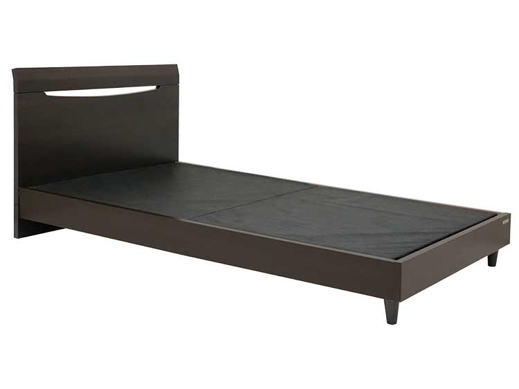 This is the Seluna bed. It comes with a straight headboard to minimize size and make sure it fits even in compact bedrooms. The headboard is slightly rounded on the edges to give a soft feel, and for design there is a horizontal slit in the headboard. It is perfect as a children's bed or even for guests, and it is very cost-efficient due to the basic design.