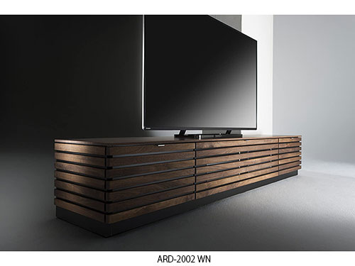 This is made with walnut wood in oil finish. The louver design is applied on even the sides, to make it look great with the natural wood, not only on the front but on all sides. This shows the commitment to luxury.