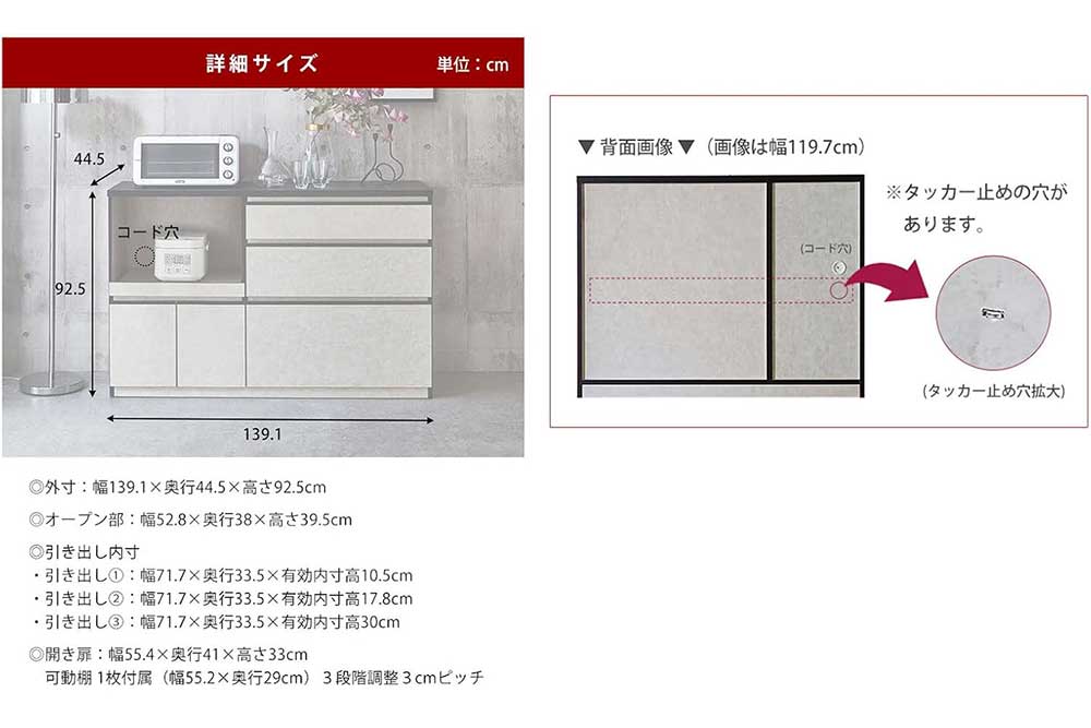 Size: W139.1 x D44.5 x H92.5 cm