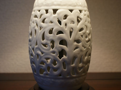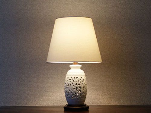 The combination of the openwork base and simple shade gives this table lamp a neat and elegant impression. The gentle light falling on the milky white porcelain creates a sense of tranquility and calm.
