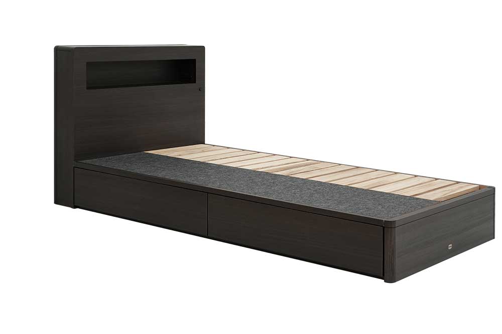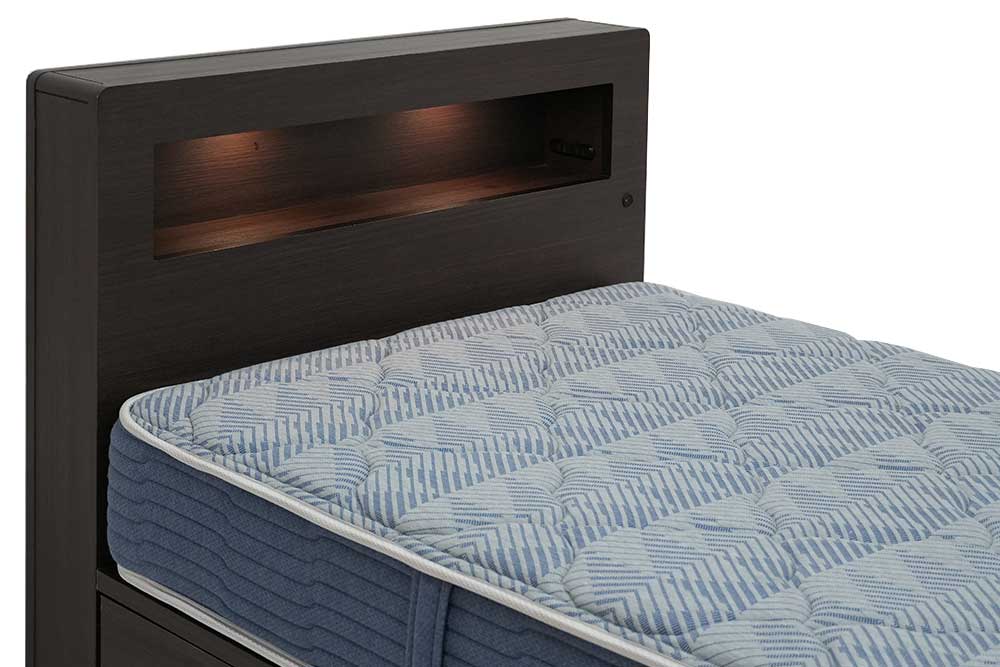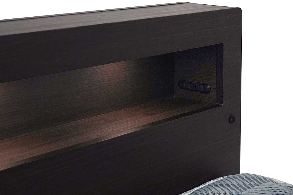 This box type headboard is what you have been looking for. It comes with a shelf space with built-in LED lights and outlets for charging smart phones, etc.