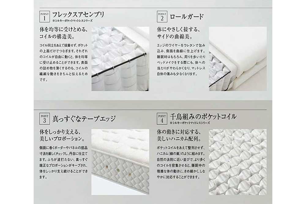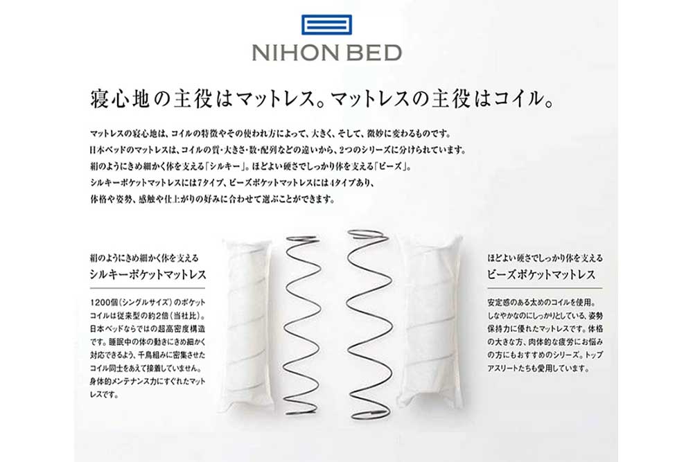 A mattress that incorporates high density pocket coils, each of which is an independent spring. This is the answer to a quality sleep. By distributing body pressure appropriately and suppressing excessive tossing and turning, it prevents energy loss. Vibrations are not easily transmitted throughout the mattress, so there is no need to worry about disturbing your sleep. And the attention to detail in the comfort of the mattress is unique to Nippon Bed. It is a shape born from experience and technical skill.