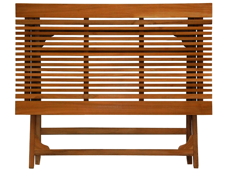A folding table with a simple design and beautiful wood grain. It is a teak wood that turns silver gray with continued use.